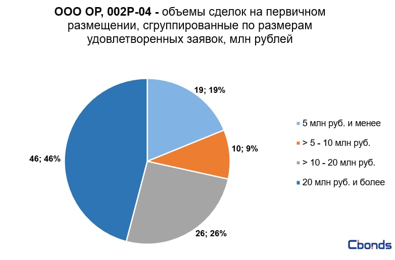 Наибольшую долю в структуре размещения (43%) заняла сделка объёмом 140 млн рублей, на втором месте идёт сделка объёмом 60 млн рублей (19%).