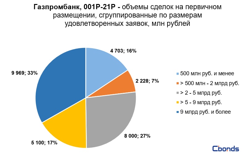 Наибольшую долю в структуре размещения (33%) заняла сделка объёмом 9.969 млрд рублей, на втором месте идут сделки объёмом от 2 до 5 млрд рублей (27%).
