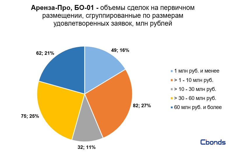 Наибольшую долю в структуре размещения (43%) заняла сделка объёмом 140 млн рублей, на втором месте идёт сделка объёмом 60 млн рублей (19%).