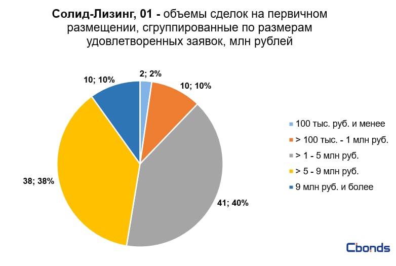 Наибольшую долю в структуре размещения (33%) заняла сделка объёмом 9.969 млрд рублей, на втором месте идут сделки объёмом от 2 до 5 млрд рублей (27%).
