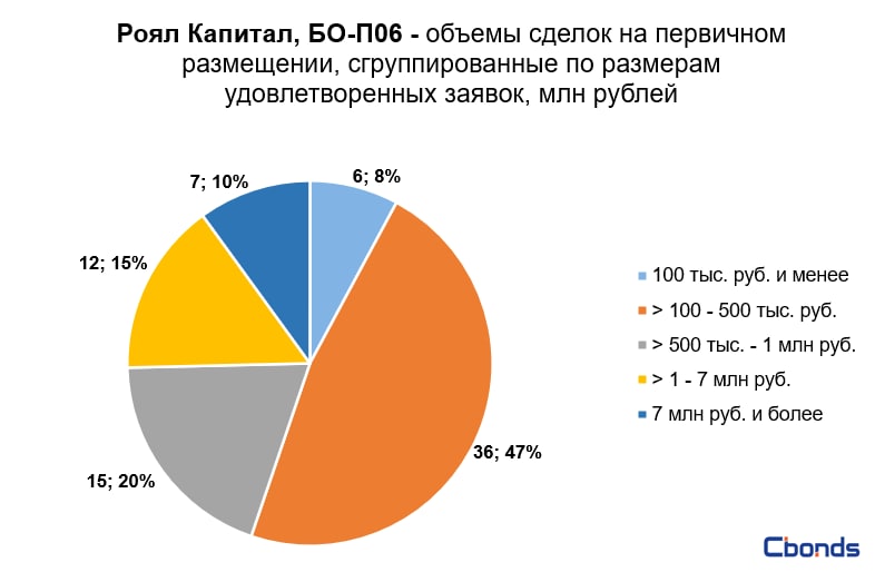 Наибольшую долю в структуре размещения (47%) заняли сделки объёмом от 100 до 500 тыс. рублей, на втором месте идут сделки объёмом от 500 тыс. до 1 млн рублей (20%).
