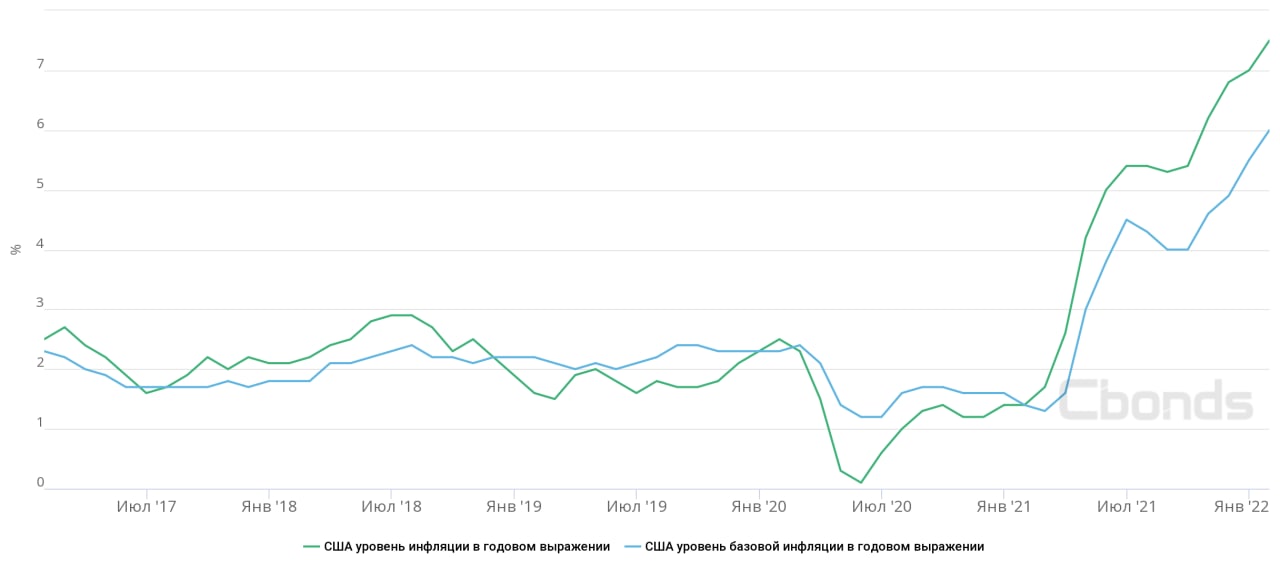 Потребительские цены в США в январе выросли до 7.5% с 7% в годовом исчислении. Такой годовой показатель вернулся к рекордам значениям почти сорокалетней давности, став максимальным с февраля 1982 года. Значение прошлого месяца стало рекордным с июня 1982 года.