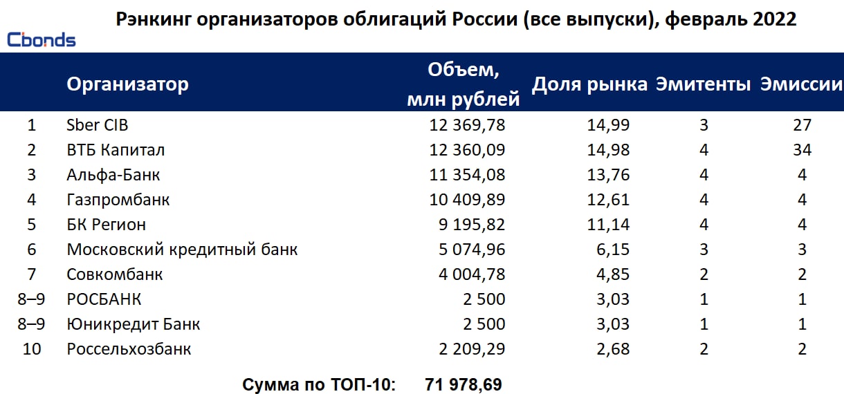В рэнкинге без учета секьюритизации, структурных, субординированных и бессрочных облигаций первые три места по итогам февраля 2022 года распределили между собой Альфа-банк, Газпромбанк и ВТБ Капитал соответственно. Всего в рэнкинге учтено 22 инвестбанка и выпуски облигаций на 68.948 млрд рублей.