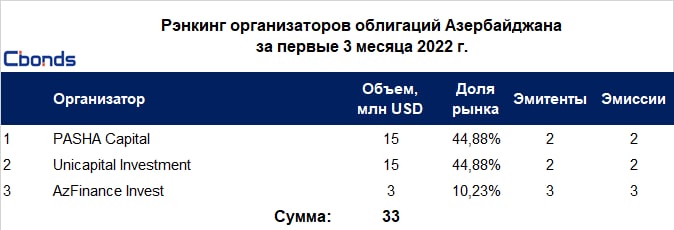 🇦🇿🔝Рэнкинг организаторов облигаций Азербайджана по итогам 3 месяцев 2022 года