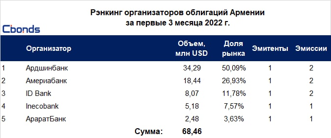 🇦🇲🏆Рэнкинг организаторов облигаций Армении по итогам 3 месяцев 2022 года