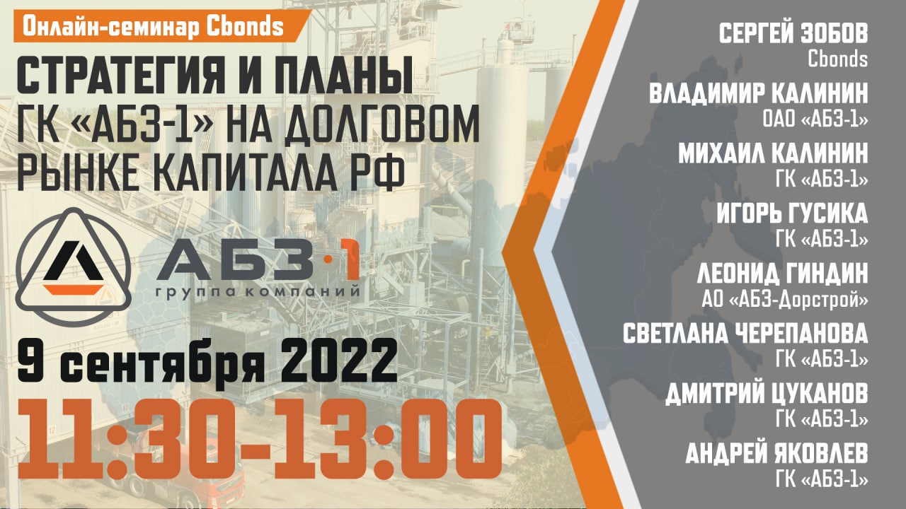 🛣Уже сегодня в 11:30 (мск): «Стратегия и планы ГК «АБЗ-1» на долговом рынке капитала РФ» – Онлайн-семинар Cbonds