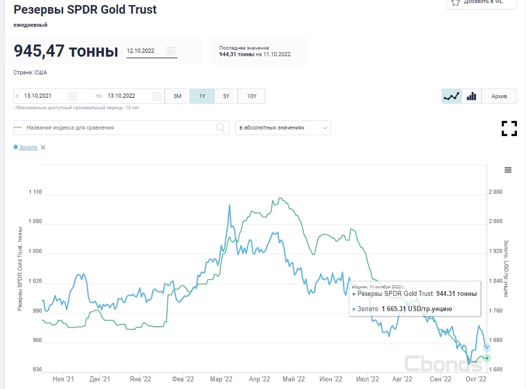 В базе индексов Cbonds появились данные по золотым запасам фонда SPDR Gold Trust. Они являются важным индикатором состояния рынка драгоценных металлов. SPDR Gold Trust – крупнейшее частное золотохранилище. Акции фонда на 100% обеспечены собственными золотыми запасами, которые на 12 октября 2022 составляют 945,47 тонн. Для сравнения, запасы золота в хранилищах центробанка России на 30 июня 2022 составляли 2298,53 тонн.