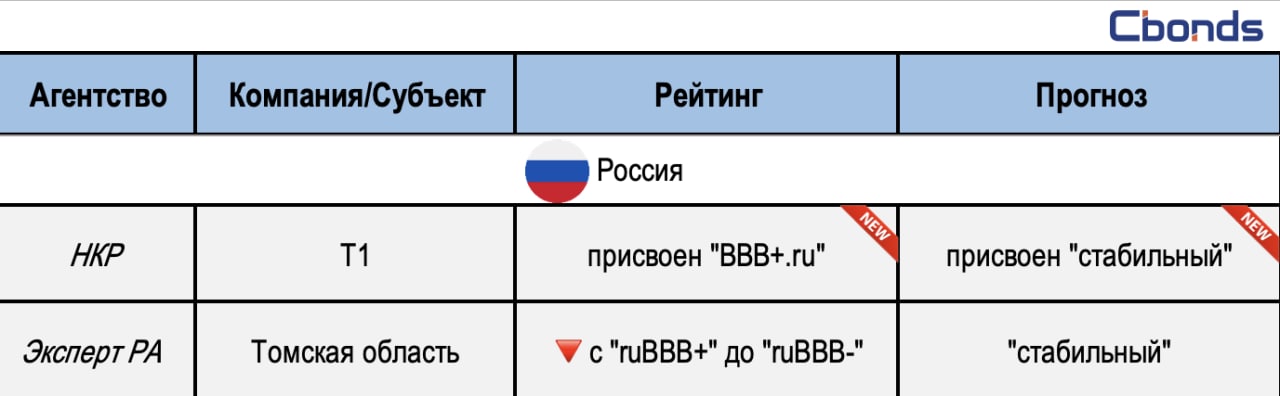 🌆Томская область: «Понижение рейтинга обусловлено применением обновленной методологии присвоения рейтингов кредитоспособности региональным и муниципальным органам власти РФ. Давление на рейтинг оказывают невысокие экономические и финансовые показатели, а также в ряде случаев негативная их динамика. Вместе с тем регион характеризуется умеренно высокой долговой нагрузкой и низкой инвестиционной активностью». (Пресс-релиз Эксперт РА)