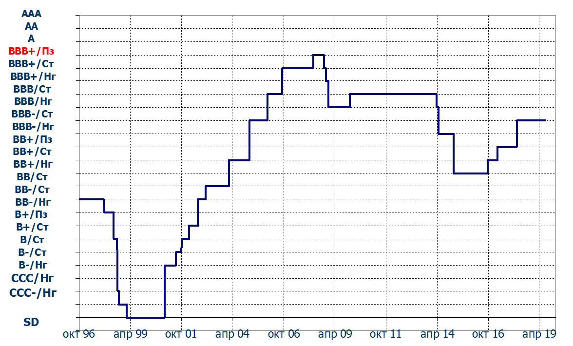 История изменения суверенных рейтингов России от агентства Standard & Poor's представлена на графике ниже👇🏻