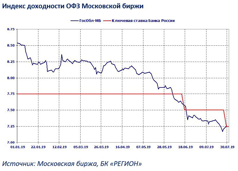 Ослабление китайской валюты и объявление США планов ввести с 1 сентября 10% пошлины на китайский импорт стоимостью 300 млрд долл снизили спрос на локальные облигации развивающихся стран. Вчера доходность десятилетних гособлигаций Бразилии выросла на 14 б.п. – до 7,37%, ЮАР – до 9,69% (+7 б.п.), Индонезии – до 7,66% (+12 б.п.), Турции – до 15,13% (+9 б.п.). Российский рынок облигаций в понедельник выглядел лучше остальных ЕМ за счет коррекции, которая прошла на прошлой неделе, а также за счет сохраняющихся сильных ожиданий снижения ключевой ставки Банком России.