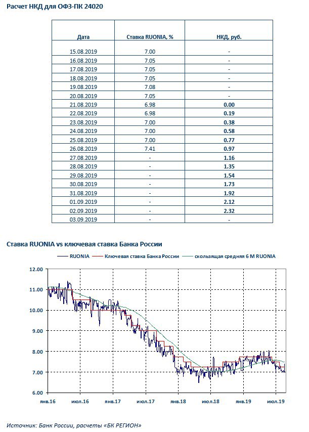 Началом обращения ОФЗ-ПК 24020 является 21 августа 2019г., датой погашения - 27 июля 2022 года. Купонный доход рассчитывается исходя из среднего значения ставок RUONIA за текущий, а не истекший как для прежних выпусков ОФЗ-ПК, купонный период с небольшим "техническим" временным лагом в семь календарных дней, обусловленным особенностями процесса выплат купонных доходов, расчета и опубликования ставки RUONIA. Ставка купонного дохода может быть рассчитана только по окончании купонного периода, при этом на каждый день (и на пять дней вперед) рассчитывается сумма НКД (см. таблицу ниже). Объявленный объем выпуска 100 млрд руб. по номинальной стоимости.