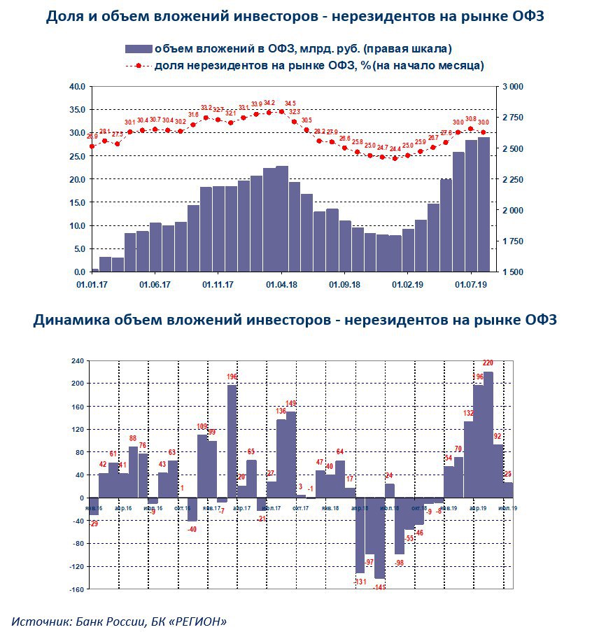 По данным Банка России, доля нерезидентов на рынке ОФЗ по состоянию на 1 августа 2019 года составляла 30%, что на 0.8% ниже показателя предыдущего месяца. Номинальный объем гособлигаций, принадлежащих нерезидентам, на 1 августа составлял 2.584 трлн. рублей при общем объеме рынка ОФЗ 8.608 трлн. рублей. Таким образом в номинальном выражении прирост вложений нерезидентов составил 25 млрд руб., в то время как прирост самого рынка ОФЗ составил 299 млрд руб. Этим и объясняется снижение доли нерезидентов по итогам июля.