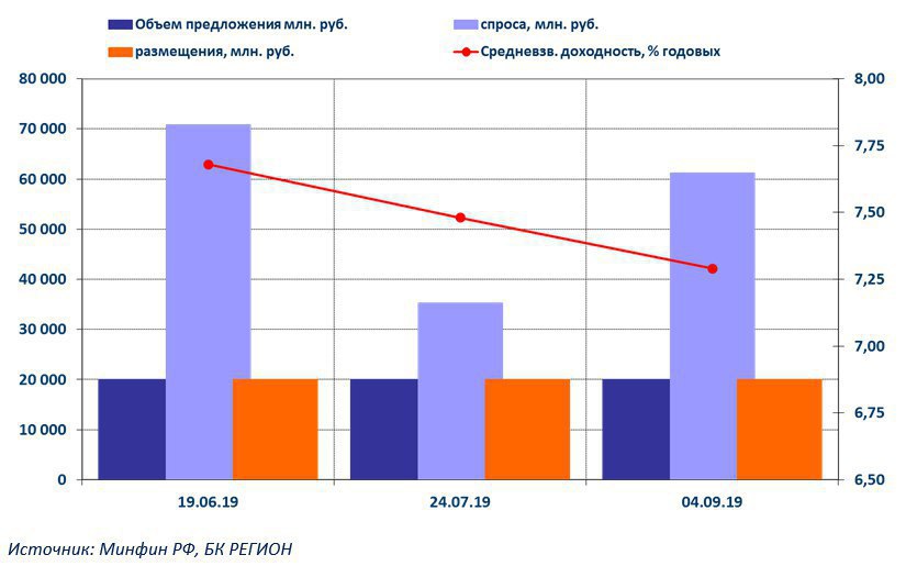 По итогам торгов 2 сентября 2019г. доходность ОФЗ в долгосрочном сегменте (с дюрацией более 5 лет) снизилась до минимальных уровней, которые были зафиксированы в конце марта 2018 г. Снижение доходности ОФЗ на «коротком» и среднесрочном отрезках «кривой», очевидно, следует ждать после снижения ключевой ставки ЦБ РФ, которое ожидается в предстоящую пятницу.