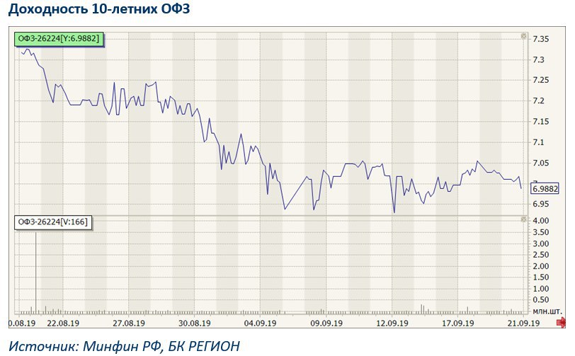 Ожидаемое снижение базовой ставки ФРС США и достаточно мягкая риторика последующих заявлений регулятора относительно дальнейшей денежно-кредитной политики могут оказать позитивное влияние на дальнейшую динамику большинства долговых рынков, в т.ч. и России. Первые результаты такого влияния были заметны уже по итогам вчерашних торгов. После роста в пределах 3-7 б.п. перед заседанием ФРС США по итогам вчерашней торговой сессии доходность ОФЗ снизилась в пределах 2-5 б.п. При этом ставка по десятилетним облигациям вновь опустилась ниже 7% годовых.
