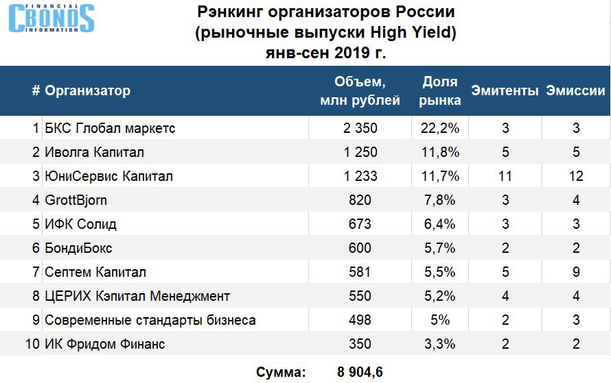 🚀Рэнкинг организаторов рыночных выпусков high-yield за янв-сен 2019 года