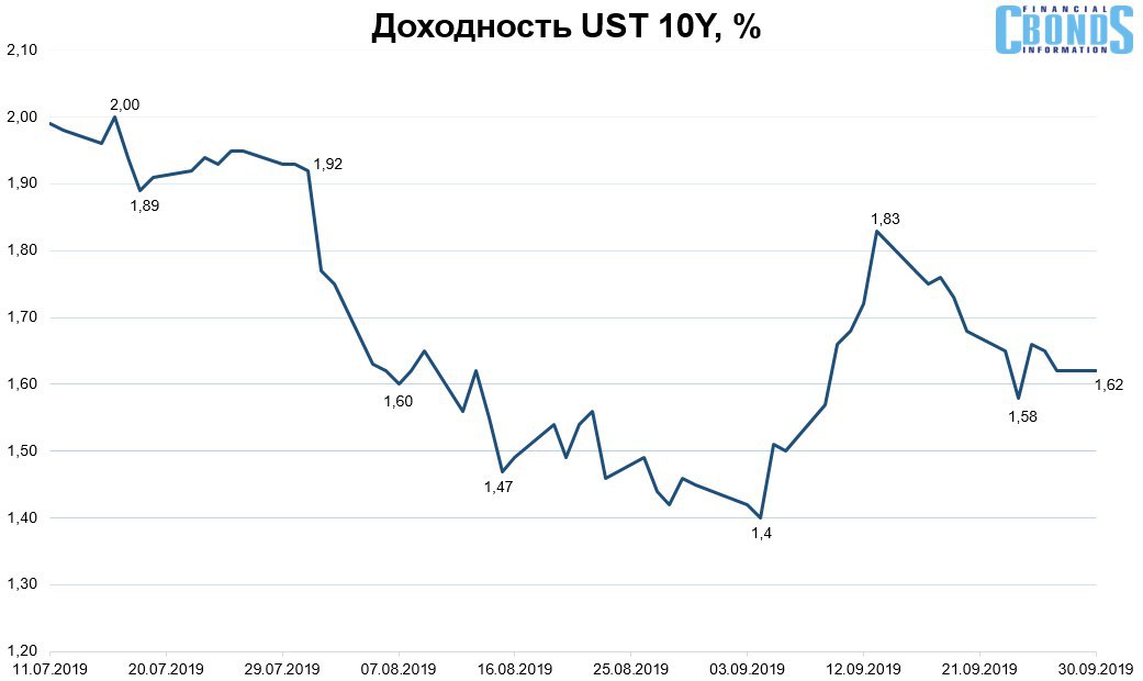 На конец сентября доходность 10-летних трежарис составила 1.62% годовых против 1.93% двумя месяцами ранее. В последнюю неделю сентября UST торговались с доходностью 1.58-1.66% годовых.
