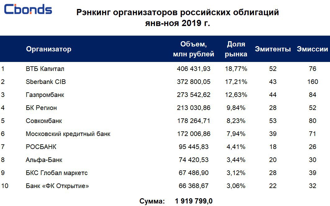 По итогам ноября в рэнкинге организаторов российских облигаций первые три места заняли ВТБ Капитал, Sberbank CIB и Газпромбанк. В этом месяце лидерство рэнкинга не изменилось, за исключением Банка «ФК Открытие», сместившего с 10-ой строчки Райффайзенбанк.