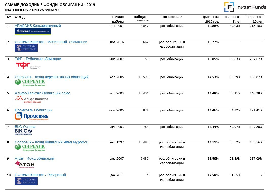 Среди бондовых фондов лучшие результаты у ПИФов, инвестирующих в рублевые корпоративные облигации. Их пайщики в 2019 заработали около 15%.