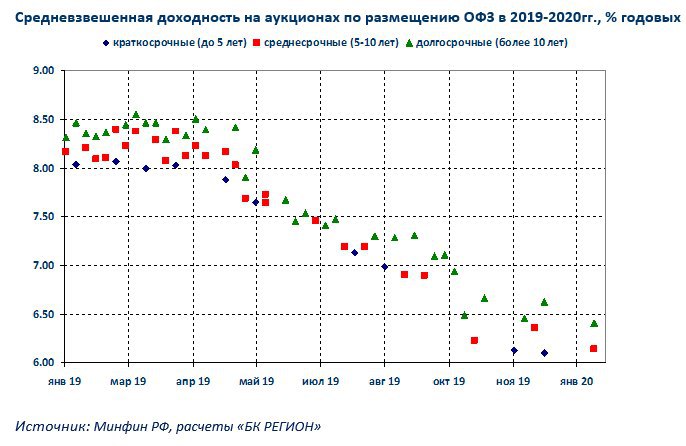 Такие результаты можно назвать не совсем ожидаемыми, принимая во внимание рост цен и снижение доходности на вторичном рынке, которые наблюдаются с конца прошлой недели после сообщения Росстата о снижении инфляции по итогам 2019 года до 3% год к году (-0,5 п.п. в декабре). В результате смены бокового тренда первых нескольких торговых дней на повышательный с конца прошлой недели - снижение доходности с начала текущего года составило в среднем 12 б.п., при этом в средне- и долгосрочном сегментах снижение достигало 17-21 б.п. Тем не менее, несмотря на произошедшее снижение ставок, привлекательность ОФЗ, на наш взгляд, сохраняется в результате роста «реальной» доходности госбумаг и ожиданий дальнейшего снижения инфляции и вслед за ней ключевой ставки Банка России.