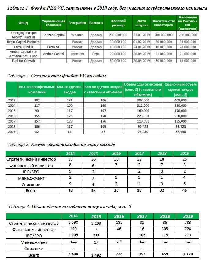 По данным портала Preqveca.ru, в 2019 году было запущено 10 новых фондов PE&VC с фокусом на Россию и СНГ с целевым размером $1,7 млрд. Объем собранных обязательств $1,6 млрд. При этом, с учетом географической аллокации эта сумма снижается до $1,15 млрд.