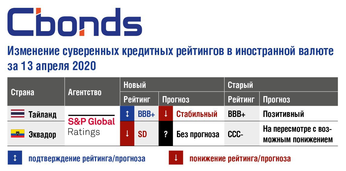 Вчера, 13 апреля, были проведены следующие рейтинговые действия: S&P Global Ratings подтвердил рейтинг Тайланда, понизив прогноз до стабильного, понизил рейтинг Эквадора до «SD» без присвоения прогноза.