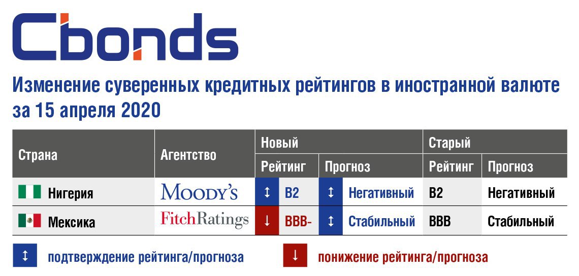 Вчера, 15 апреля, были проведены следующие рейтинговые действия: Moody's подтвердил рейтинг Нигерии, сохранив негативный прогноз. Fitch Ratings понизил рейтинг Мексики до «ВВВ-» со стабильным прогнозом.