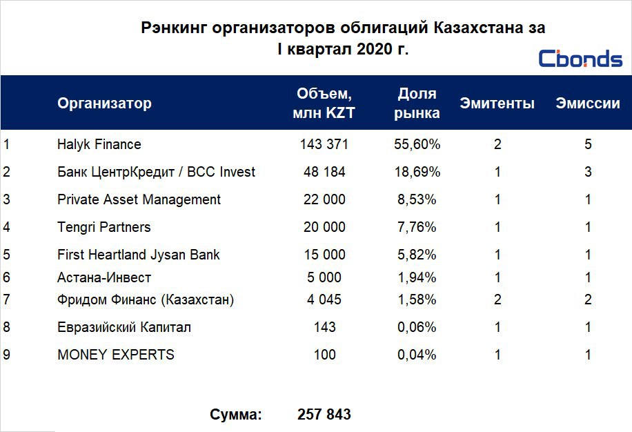 По итогам I квартала в рэнкинге организаторов выпусков облигаций Казахстана первые три места заняли Halyk Finance, банковская группа Банк ЦентрКредит / BCC Invest (3 эмиссии Казахстанского фонда устойчивости на 48.2 млрд тенге) и Private Asset Management (1 эмиссии на 22 млрд тенге).