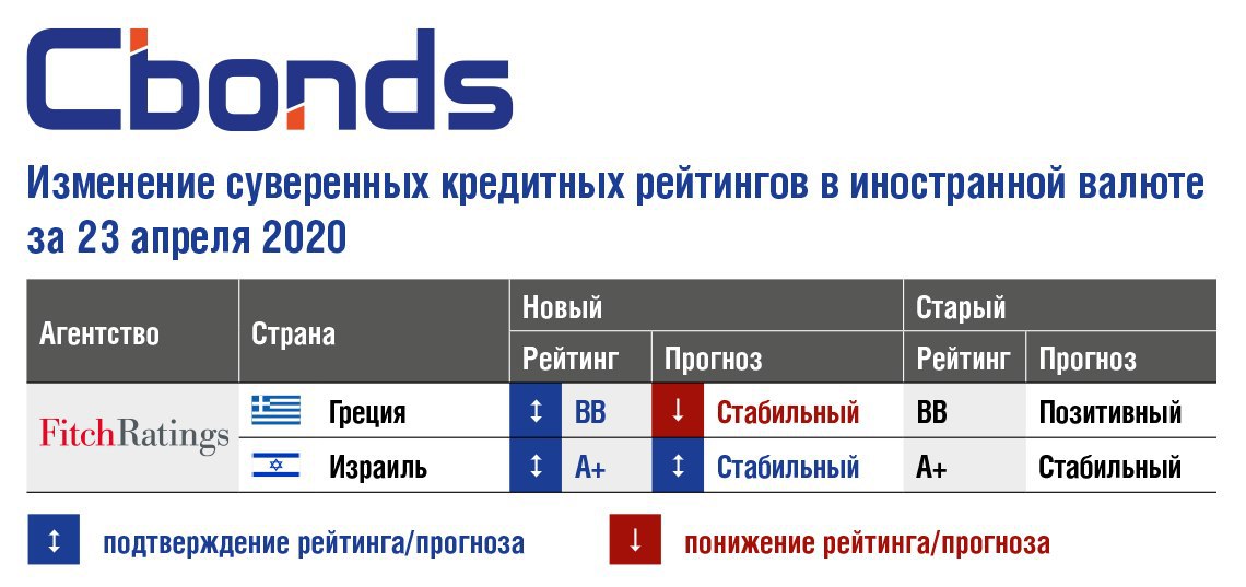 Вчера, 23 апреля, Fitch Ratings подтвердил рейтинг Греции, понизив прогноз до стабильного, и подтвердил рейтинг Израиля со стабильным прогнозом.