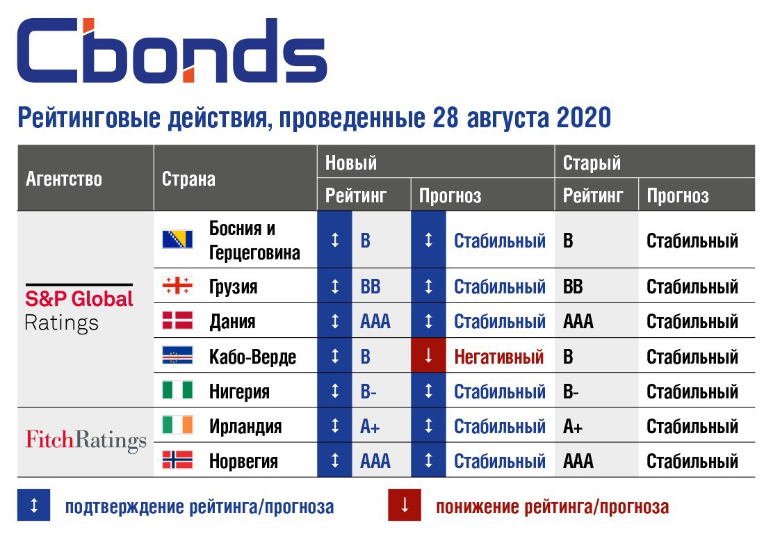 🔸S&P Global Ratings подтвердило рейтинги Боснии и Герцеговины, Грузии, Дании и Нигерии со стабильным прогнозом и рейтинг Кабо-Верде, пересмотрев прогноз со стабильного на негативный.