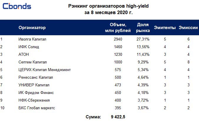 💡Рэнкинг организаторов рыночных выпусков high-yield по итогам 8 месяцев 2020 года