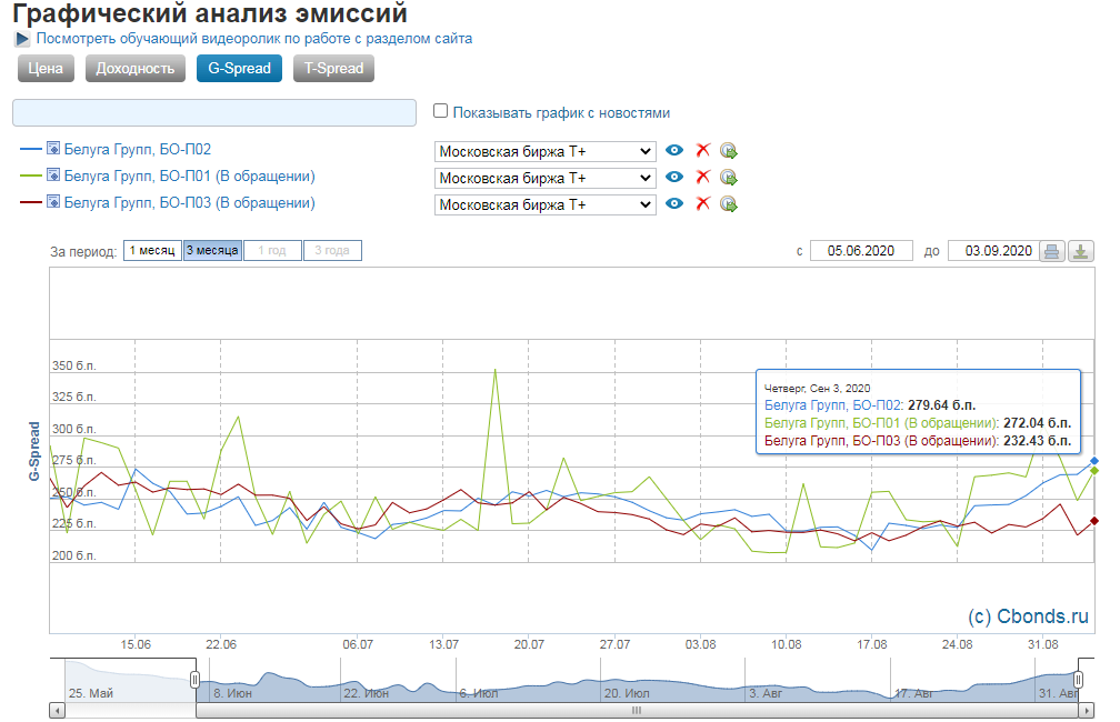 Глядя на 3-ех мес. график мы видим, что данный выпуск на 03.09.2020 имеет наибольший спред, среди остальных выпусков (одинаковое кредитное качество), и этот спред выше среднеисторического, поэтому выпуск Белуга БО-П02 интересен по цене 105,55 / 7,58%.