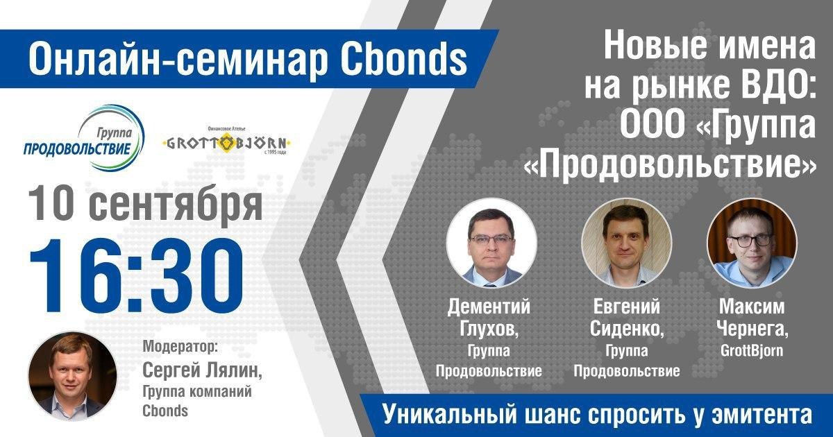 10 сентября в 16:30 состоится онлайн-семинар Cbonds «Новые имена на рынке ВДО: ООО «Группа «Продовольствие».