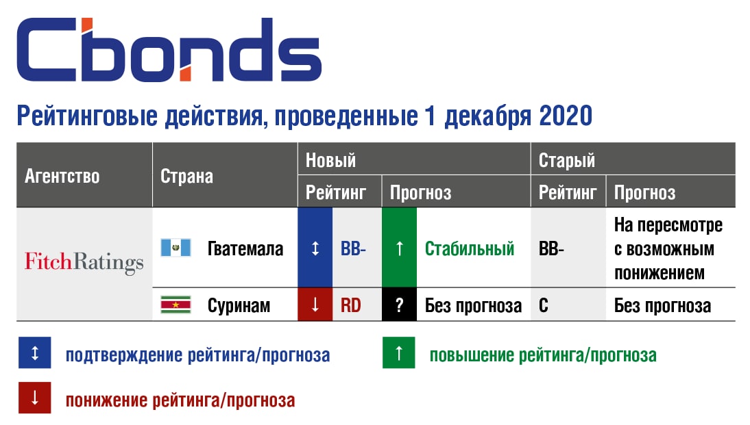 🔹Fitch Ratings подтвердило рейтинг Гватемалы, изменив прогноз на стабильный и понизило рейтинг Суринама до "RD" без присвоения прогноза.