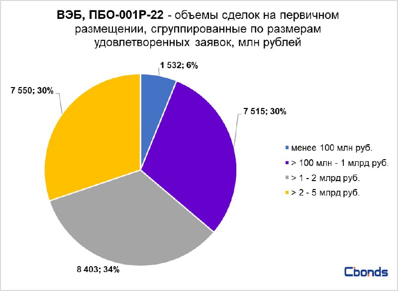 Cделки размером от 1 до 2 млрд руб. составили 34% от объема размещения, на втором месте сделки размером от 2 до 5 млрд руб., занявшие 30% от общего объема.