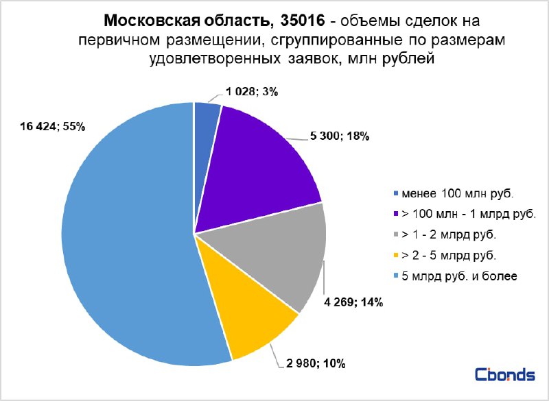 Самая крупная сделка размером 16.423 млрд руб. составила 55% от объема размещения, на втором месте – сделки размером от 100 млн до 1 млрд руб., занявшие 18% от общего объема.