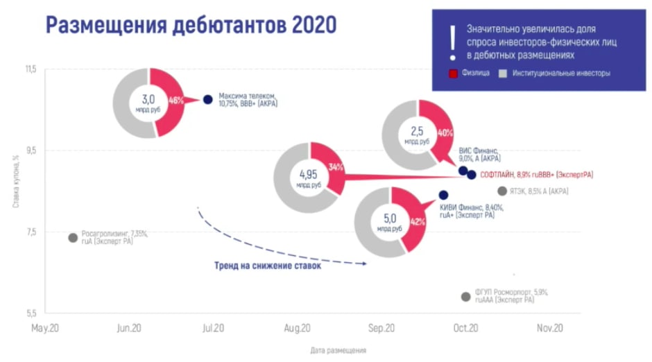 В рамках выступления Александр отменил значительный рост доли спроса инвесторов-физиков. В дебютных размещениях до 100% объема составляют заявки от физических лиц.