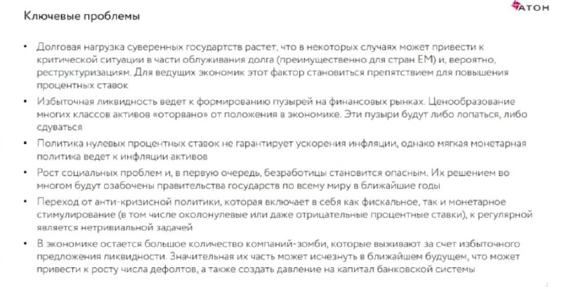 На рынке наблюдается избыточный уровень долговой нагрузки, особенно в развивающихся странах. Так, например, Мальдивские острова закончат 2020 год с долгом к ВВП в размере 120%. Александр рассматривает высокую возможность реструктуризация и списания долга в 2021 года при активной поддержке МВФ.
