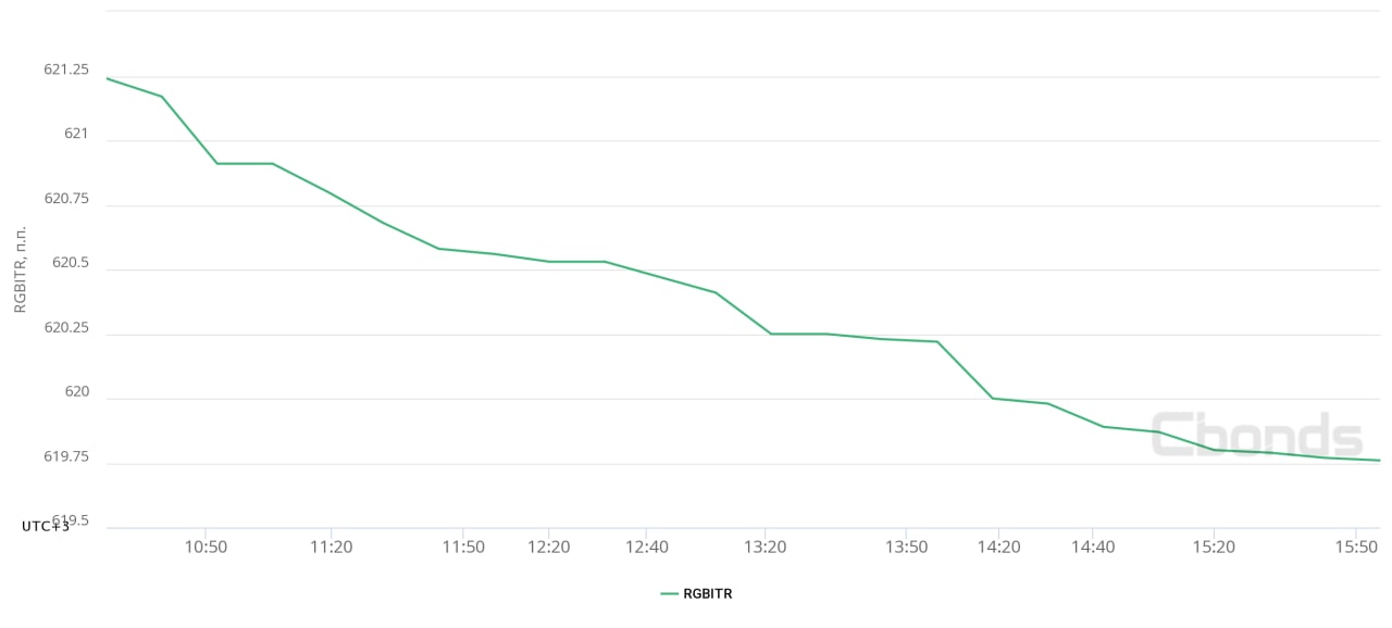 📊 На 15:59 (мск) значение RGBITR, индекса государственных облигаций Мосбиржи, составляет 619,76 п.п. относительно 621,25 п.п. по итогам торгов пятницы.