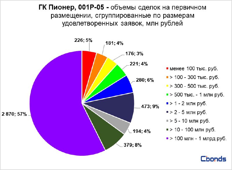 Наибольшую долю в структуре размещения (87%) заняли сделки объемом от 100 млн до 1 млрд, второе место заняли сделки размером от 10 до 100 млн рублей (10%).