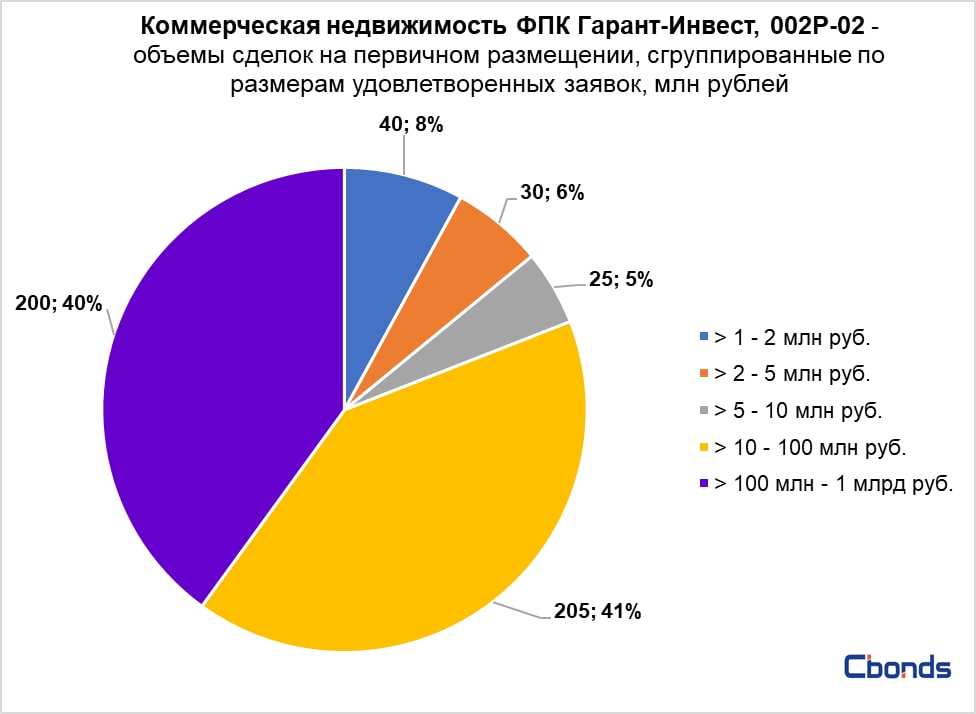 Наибольшую долю в структуре размещения (41%) заняли сделки от 10 до 100 млн рублей, самая же крупная сделка объемом 200 млн рублей заняла второе место и долю в 40% от общего объема размещения.