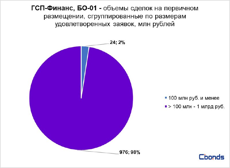 Наибольшую долю в структуре размещения (98%) заняли сделки от 100 млн до 1 млрд рублей, оставшиеся 2% заняли сделки размером 100 млн рублей и менее.