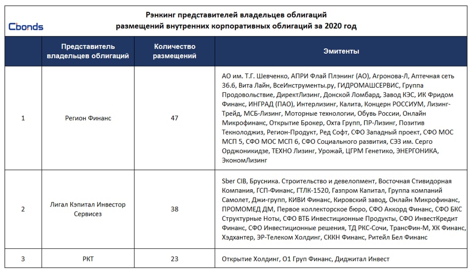 🏆 Рэнкинг представителей владельцев облигаций (ПВО) внутренних размещений российских эмитентов по итогам 2020 года