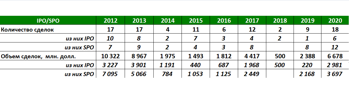 В конце отметим, что единственными нероссийскими эмитентами в 2020 году были казахстанские компании – IPO Kazpi.kz и приватизационное SPO (в формате ABB) Казатомпрома на Лондонской бирже.