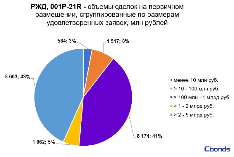 Наибольшую долю в структуре размещения (43%) заняли сделки от 2 до 5 млрд рублей, на втором месте идут сделки от 100 млн до 1 млрд рублей (41%).