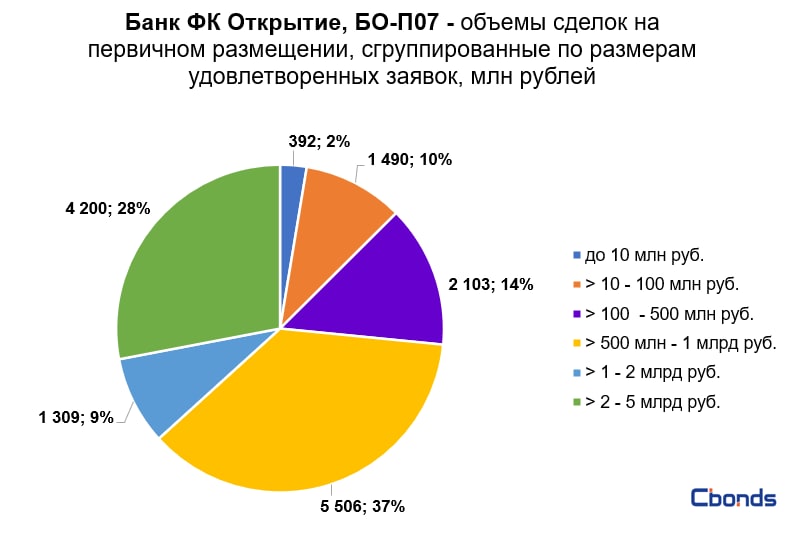 Наибольшую долю в структуре размещения (37%) заняли сделки от 500 млн до 1 млрд рублей, на втором месте идут сделки от 2 до 5 млрд рублей (28%).