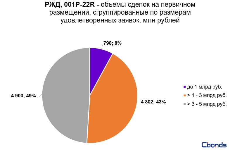 Наибольшую долю в структуре размещения (49%) заняла сделка на 4.9 млрд рублей, на втором месте идут сделки от 1 до 3 млрд рублей (43%).