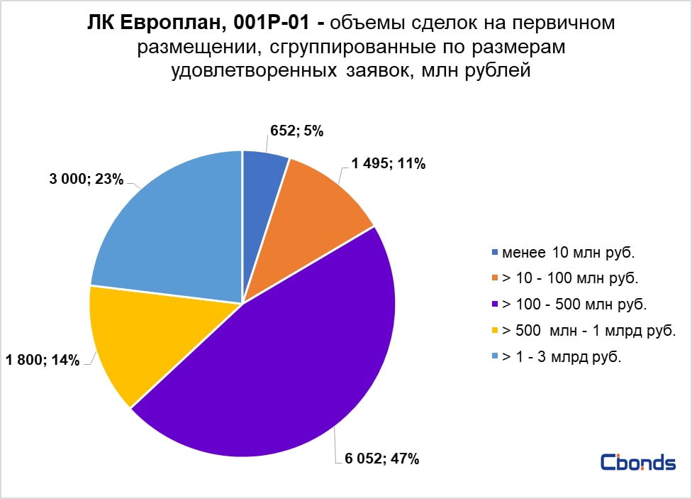 Наибольшую долю в структуре размещения (47%) заняли сделки от 100 до 500 млн рублей, на втором месте идет сделка на 3 млрд рублей (23%).