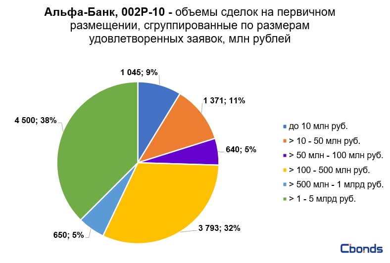 Наибольшую долю в структуре размещения (38%) заняла сделка на 4.5 млрд рублей, на втором месте идут сделки от 100 до 500 млн рублей (32%).