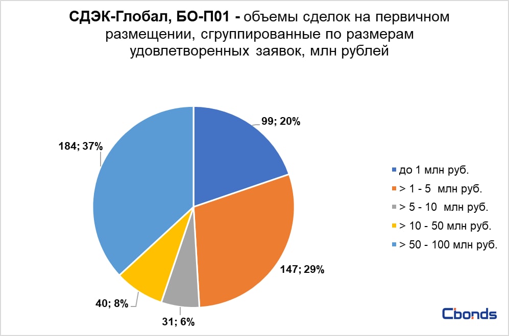 Наибольшую долю в структуре размещения (37%) заняли сделки от 50 до 100 млн рублей, на втором месте идут сделки от 1 до 5 млн рублей (29%).