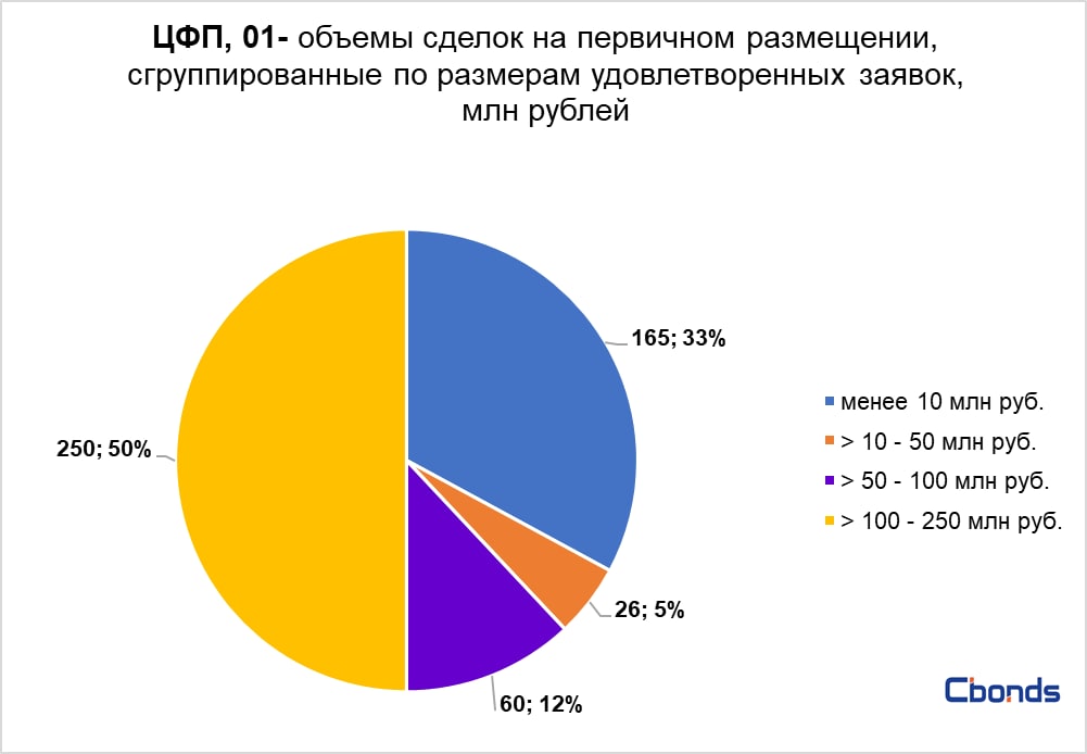 Наибольшую долю в структуре размещения (50%) заняла сделка на 250 млн рублей, на втором месте идут сделки объемом менее 10 млн рублей (33%).
